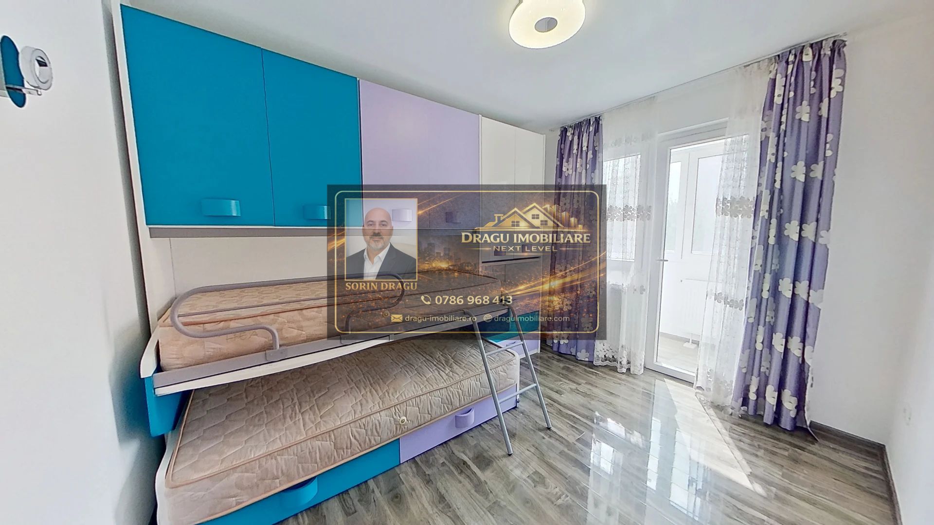 Living luminos, amenajat modern, dormitor matrimonial elegant, cameră pentru copii dotată cu paturi suprapuse, bucătărie open-space complet echipată, baie cu duș și bideu, dressing spațios