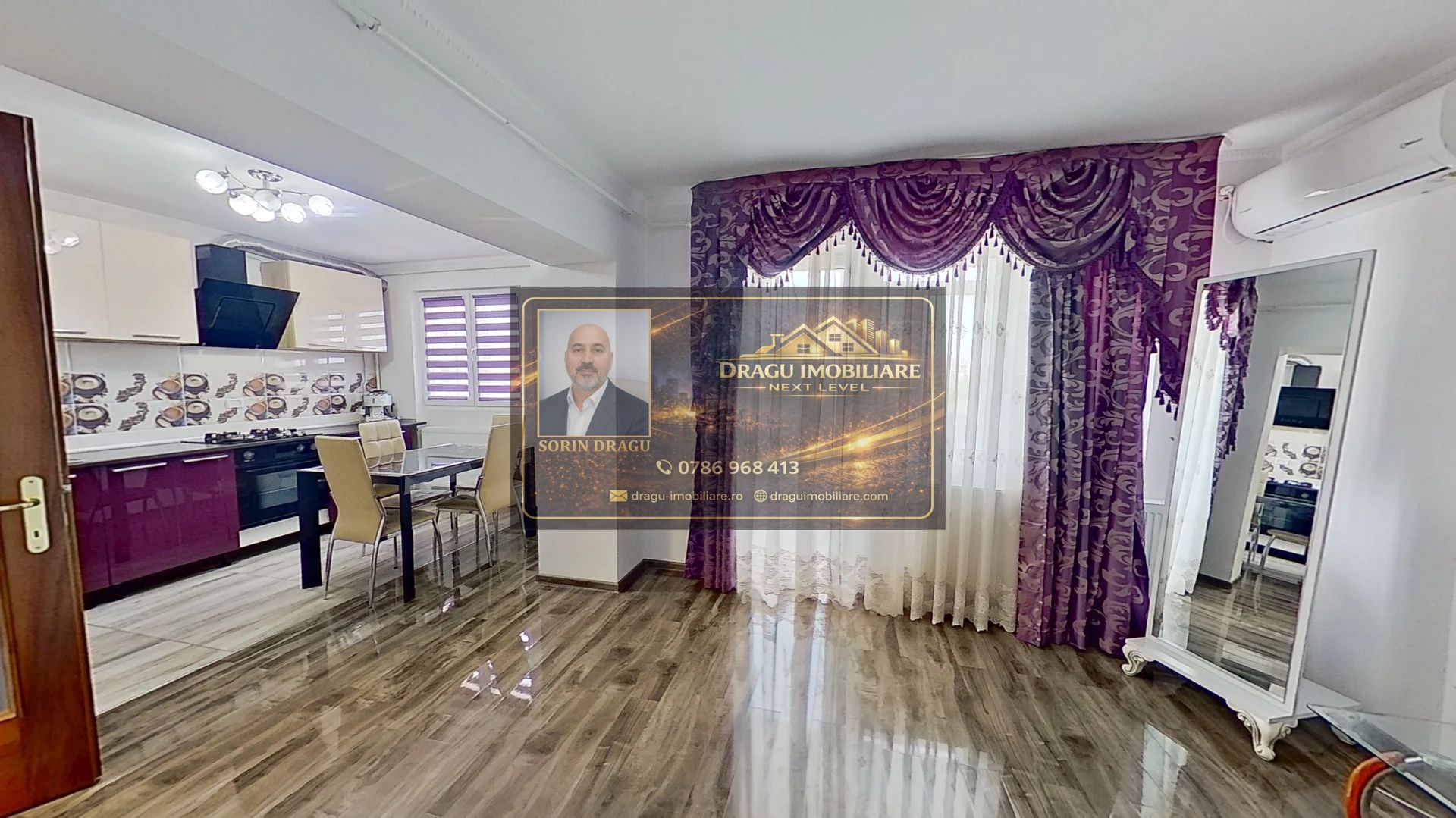 Apartamentul beneficiază de finisaje moderne și dotări precum aer condiționat și interfon cu cameră video.